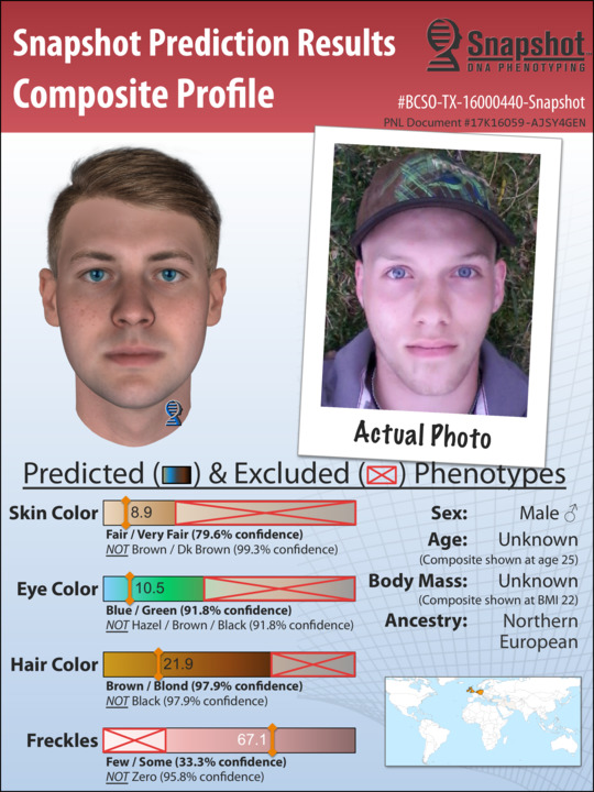Soon thereafter, the Brown County Sheriff, Vance Hill, and District Attorney, Michael Murray, engaged Parabon to produce a Snapshot report on the male DNA obtained from the crime scene. Within weeks, Parabon produced the report which revealed the perpetrator to most likely be a white male of European ancestry with brown or light brown hair, blue or green eyes and some freckling. In a press conference on 8 November 2017, Sheriff Hill released the results to the public.